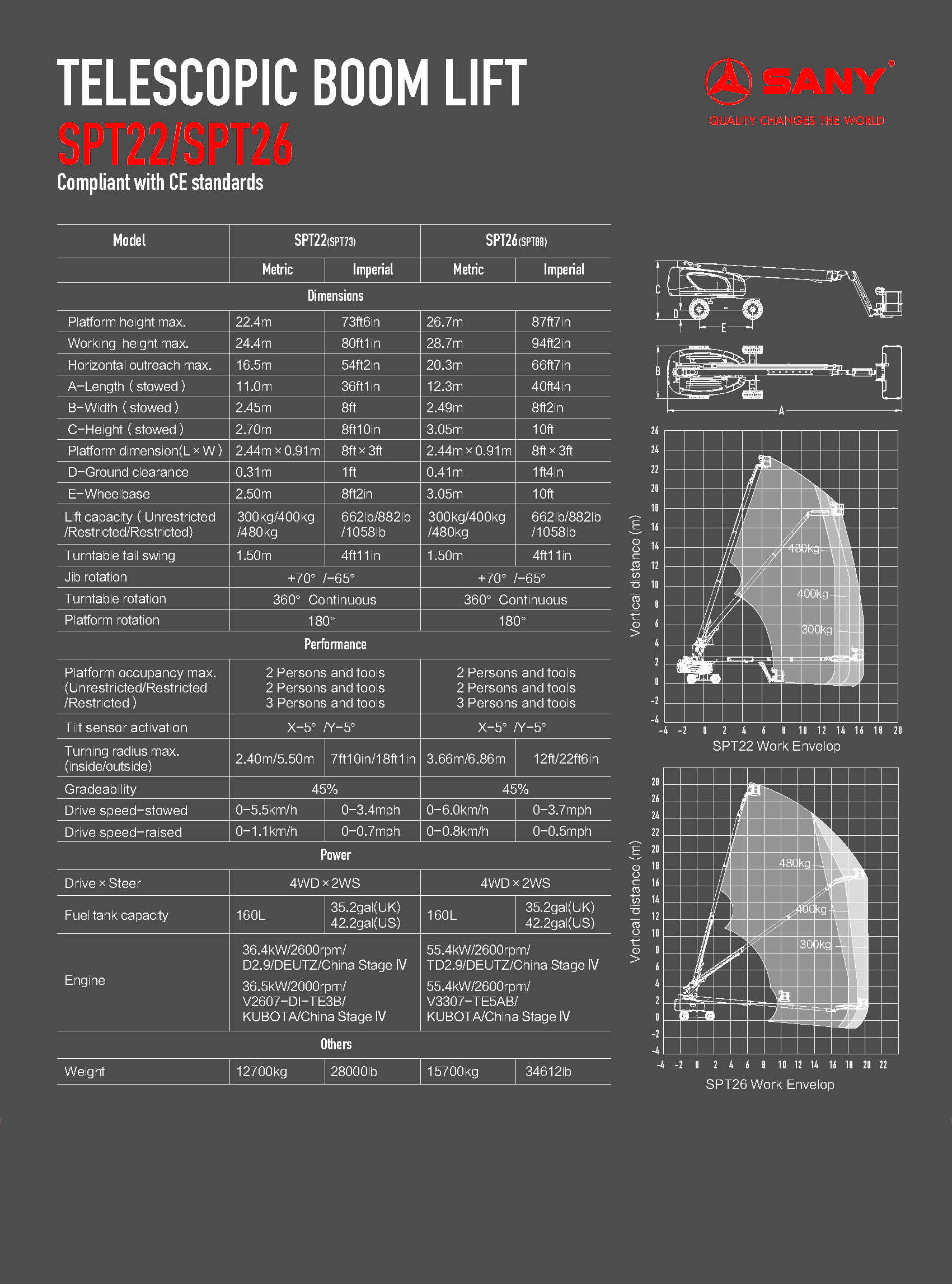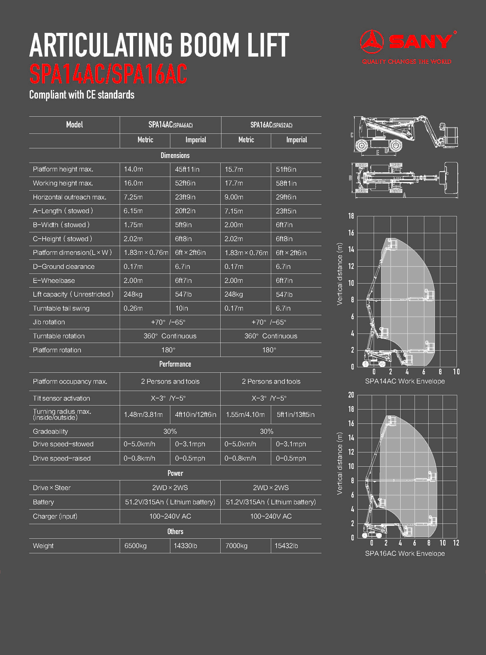 SPA16AC Turntable tail swing:0.17m Working height max: 17.7m Platform height max: 15.7m Horizontal outreach max:9.0m Lift capacity: 248kg(unrestricted)
