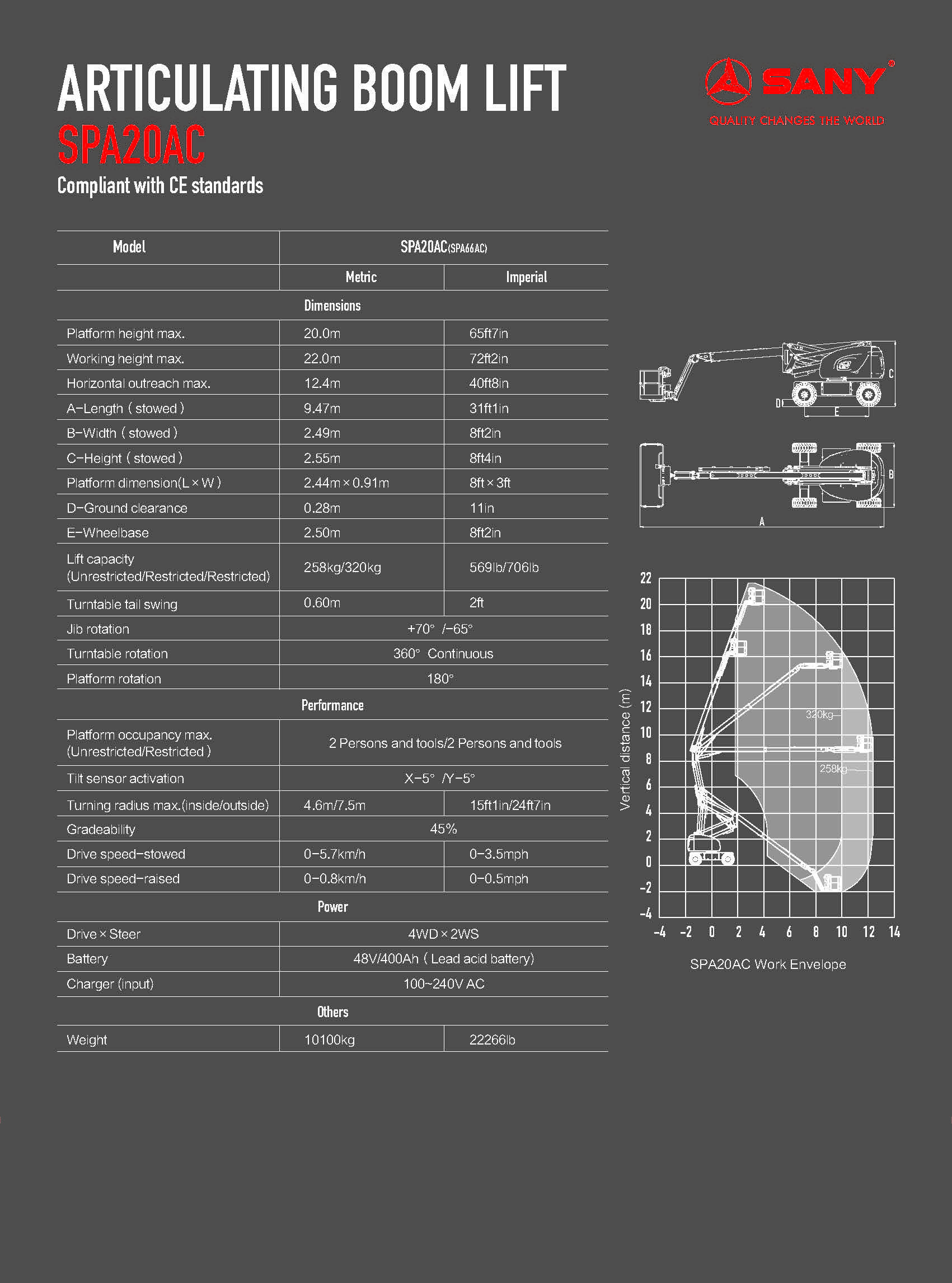 Turntable tail swing:0.6m Working height max: 22.0m Platform height max: 20.0m Horizontal outreach max:12.4m Lift capacity: 258/320kg (unrestricted/restricted) |